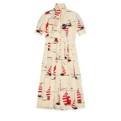 La collezione Ouverture gioca con il contrasto tra silhouette classiche e dettagli contemporanei. Capi casual sono elevati da stampe d'ispirazione vintage, come questo abito in cotone e lino con stampa nautica.